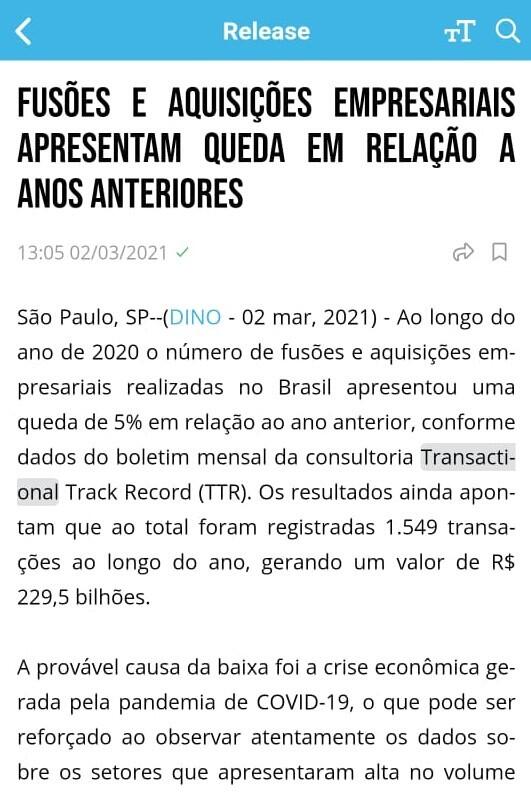Ao longo do ano de 2020 o número de fusões e aquisições empresariais realizadas no Brasil apresentou uma queda de 5% em relação ao ano anterior, conforme dados do boletim mensal da consultoria Transactional Track Record (TTR). Os resultados ainda apontam que ao total foram registradas 1.549 transações ao longo do ano, gerando um valor de R$ 229,5 bilhões.