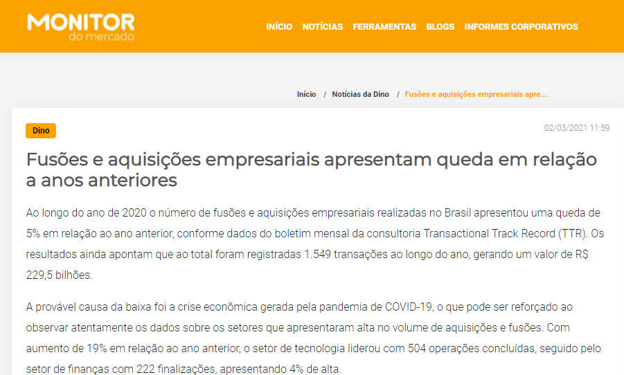 Ao longo do ano de 2020 o número de fusões e aquisições empresariais realizadas no Brasil apresentou uma queda de 5% em relação ao ano anterior, conforme dados do boletim mensal da consultoria Transactional Track Record (TTR). Os resultados ainda apontam que ao total foram registradas 1.549 transações ao longo do ano, gerando um valor de R$ 229,5 bilhões.