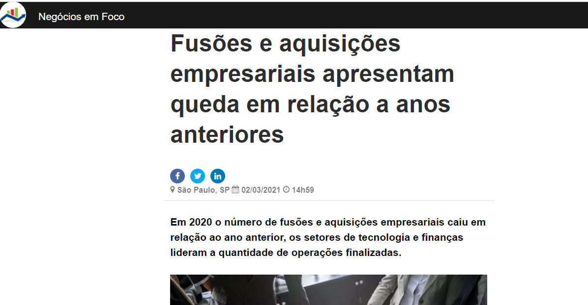 Em 2020 o número de fusões e aquisições empresariais caiu em relação ao ano anterior, os setores de tecnologia e finanças lideram a quantidade de operações finalizadas.