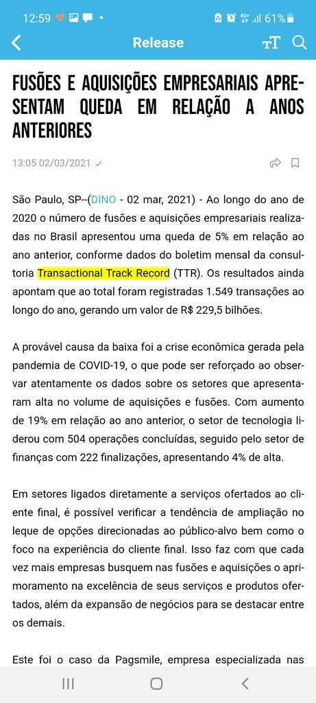 Ao longo do ano de 2020 o número de fusões e aquisições empresariais realizadas no Brasil apresentou uma queda de 5% em relação ao ano anterior, conforme dados do boletim mensal da consultoria Transactional Track Record (TTR). Os resultados ainda apontam que ao total foram registradas 1.549 transações ao longo do ano, gerando um valor de R$ 229,5 bilhões.