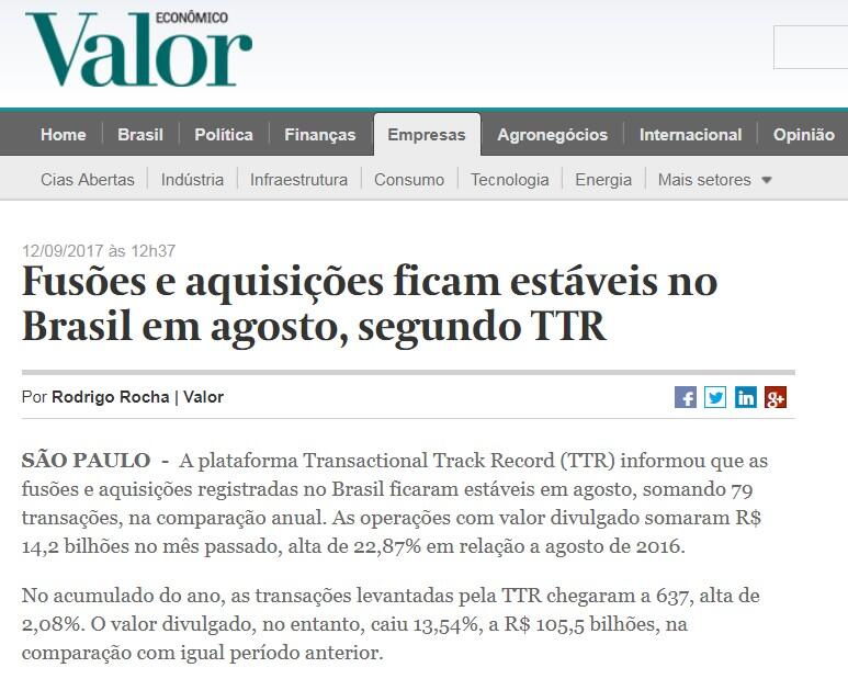 SÃO PAULO - A plataforma Transactional Track Record (TTR) informou que as fusões e aquisições registradas no Brasil ficaram estáveis em agosto, somando 79 transações, na comparação anual. As operações com valor divulgado somaram R$ 14,2 bilhões no mês passado, alta de 22,87% em relação a agosto de 2016.