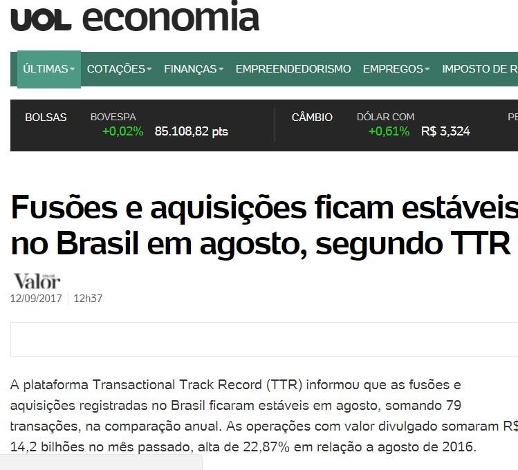 A plataforma Transactional Track Record (TTR) informou que as fusões e aquisições registradas no Brasil ficaram estáveis em agosto, somando 79 transações, na comparação anual. As operações com valor divulgado somaram R$ 14,2 bilhões no mês passado, alta de 22,87% em relação a agosto de 2016.
