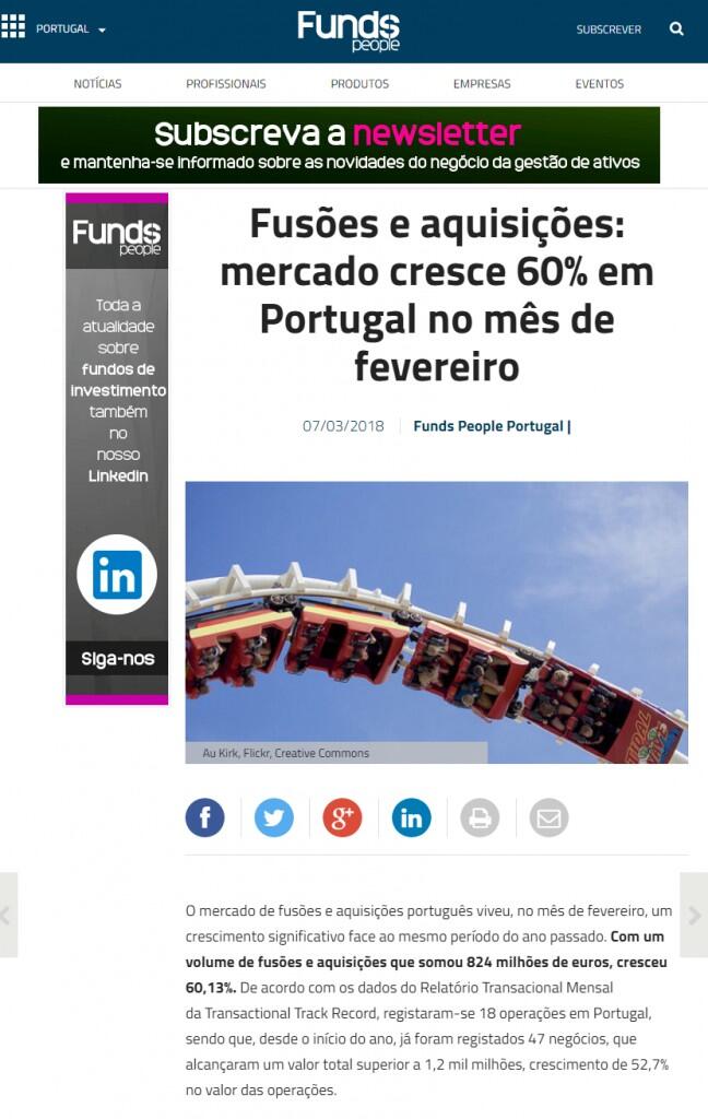 O mercado de fusões e aquisições português viveu, no mês de fevereiro, um crescimento significativo face ao mesmo período do ano passado. Com um volume de fusões e aquisições que somou 824 milhões de euros, cresceu 60,13%. De acordo com os dados do Relatório Transacional Mensal da Transactional Track Record, registaram-se 18 operações em Portugal, sendo que, desde o início do ano, já foram registados 47 negócios, que alcançaram um valor total superior a 1,2 mil milhões, crescimento de 52,7% no valor das operações.