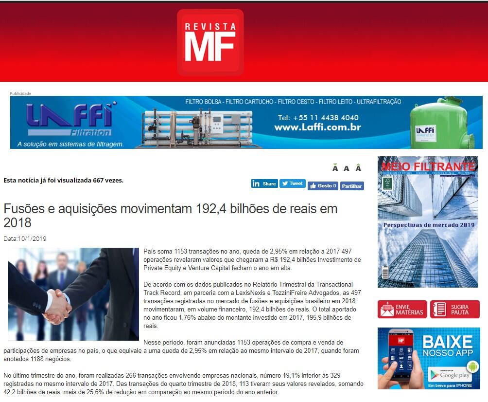 De acordo com os dados publicados no Relatório Trimestral da Transactional Track Record, em parceria com a LexisNexis e TozziniFreire Advogados, as 497 transações registradas no mercado de fusões e aquisições brasileiro em 2018 movimentaram, em volume financeiro, 192,4 bilhões de reais. O total aportado no ano ficou 1,76% abaixo do montante investido em 2017, 195,9 bilhões de reais.