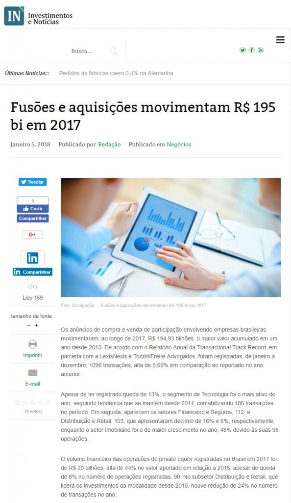 Os anúncios de compra e venda de participação envolvendo empresas brasileiras movimentaram, ao longo de 2017, R$ 194,93 bilhões, o maior valor acumulado em um ano desde 2013. De acordo com o Relatório Anual da Transactional Track Record, em parceria com a LexisNexis e TozziniFreire Advogados, foram registradas, de janeiro a dezembro, 1096 transações, alta de 5,69% em comparação ao reportado no ano anterior.
