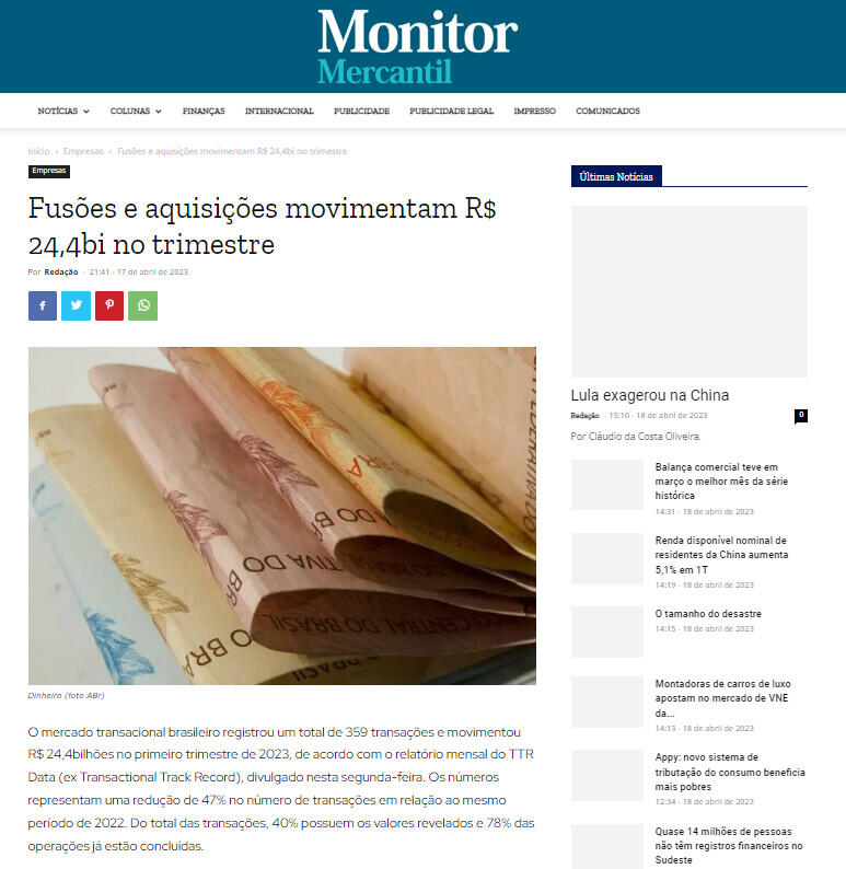 A transação destacada pelo TTR Data no primeiro trimestre de 2023, foi a venda peloa Banco Santander Brasil de 40% da WebMotors para a companhia australiana CarSales.com. O valor da transação é de R$ 1,2 bi. os compradores já eram donos de 30% do marketplace de veículos. A operação contou com a assessoria jurídica em lei brasileira dos escritórios Advocacia José Del Chiaro; Castro Barros Advogados; e Pinheiro Neto Advogados.