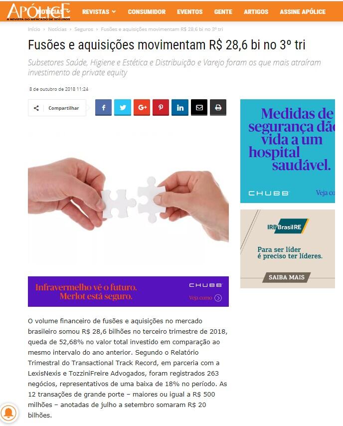 O volume financeiro de fusões e aquisições no mercado brasileiro somou R$ 28,6 bilhões no terceiro trimestre de 2018, queda de 52,68% no valor total investido em comparação ao mesmo intervalo do ano anterior. Segundo o Relatório Trimestral do Transactional Track Record, em parceria com a LexisNexis e TozziniFreire Advogados, foram registrados 263 negócios, representativos de uma baixa de 18% no período. As 12 transações de grande porte – maiores ou igual a R$ 500 milhões – anotadas de julho a setembro somaram R$ 20 bilhões.