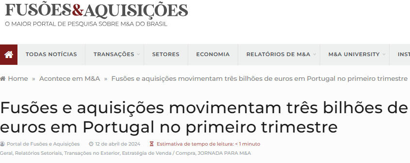 As fusões e aquisições que envolveram empresas portuguesas movimentaram três biilhões de euros nos 140 negócios que foram registrados durante o primeiro trimestre de 2024, de acordo com o relatório enviado esta quinta-feira pela TTR Data.