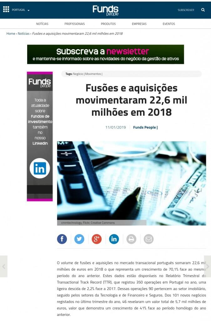 O volume de fusões e aquisições no mercado transacional português somaram 22,6 mil milhões de euros em 2018 o que representa um crescimento de 70,1% face ao mesmo período do ano anterior. Estes dados estão disponíveis no Relatório Trimestral do Transactional Track Record (TTR), que registou 350 operações em Portugal no ano, uma ligeira descida de 2,2% face a 2017. Dessas operações 90 pertencem ao setor imobiliário, seguido pelos setores da Tecnologia e de Financeiro e Seguros. Dos 101 novos negócios registados no último trimestre do ano, 46 revelaram um valor total de 5,7 mil milhões de euros, valor que demonstra um crescimento de 41% face ao período homólogo do ano anterior.