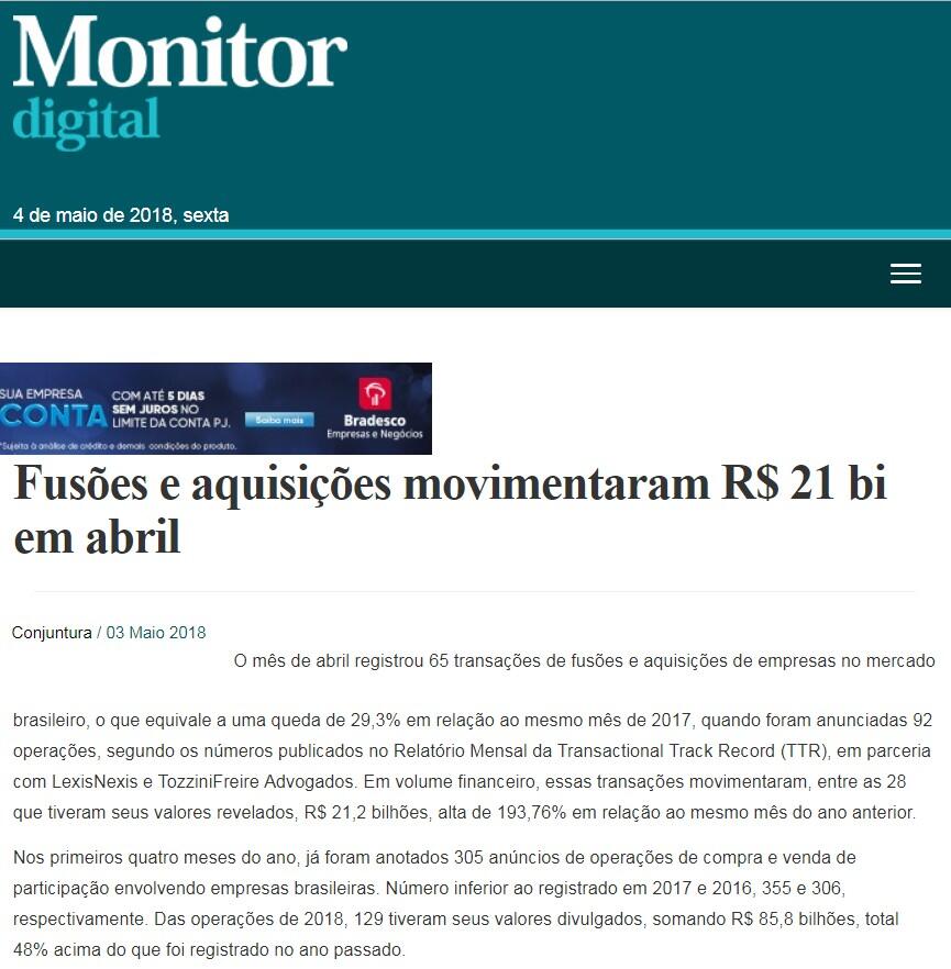O mês de abril registrou 65 transações de fusões e aquisições de empresas no mercado brasileiro, o que equivale a uma queda de 29,3% em relação ao mesmo mês de 2017, quando foram anunciadas 92 operações, segundo os números publicados no Relatório Mensal da Transactional Track Record (TTR), em parceria com LexisNexis e TozziniFreire Advogados. Em volume financeiro, essas transações movimentaram, entre as 28 que tiveram seus valores revelados, R$ 21,2 bilhões, alta de 193,76% em relação ao mesmo mês do ano anterior.