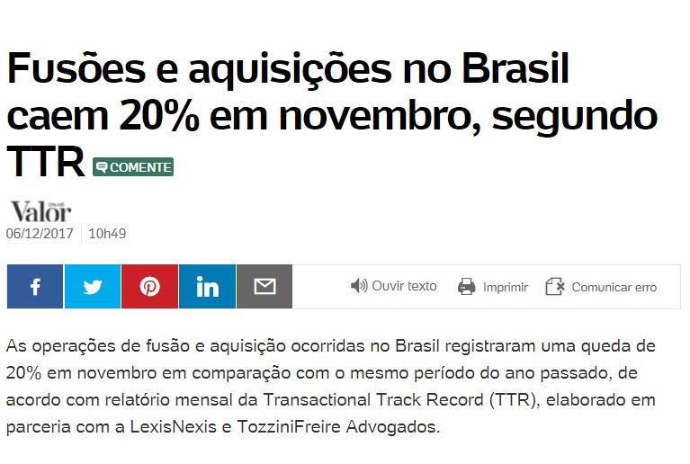 As operações de fusão e aquisição ocorridas no Brasil registraram uma queda de 20% em novembro em comparação com o mesmo período do ano passado, de acordo com relatório mensal da Transactional Track Record (TTR), elaborado em parceria com a LexisNexis e TozziniFreire Advogados.