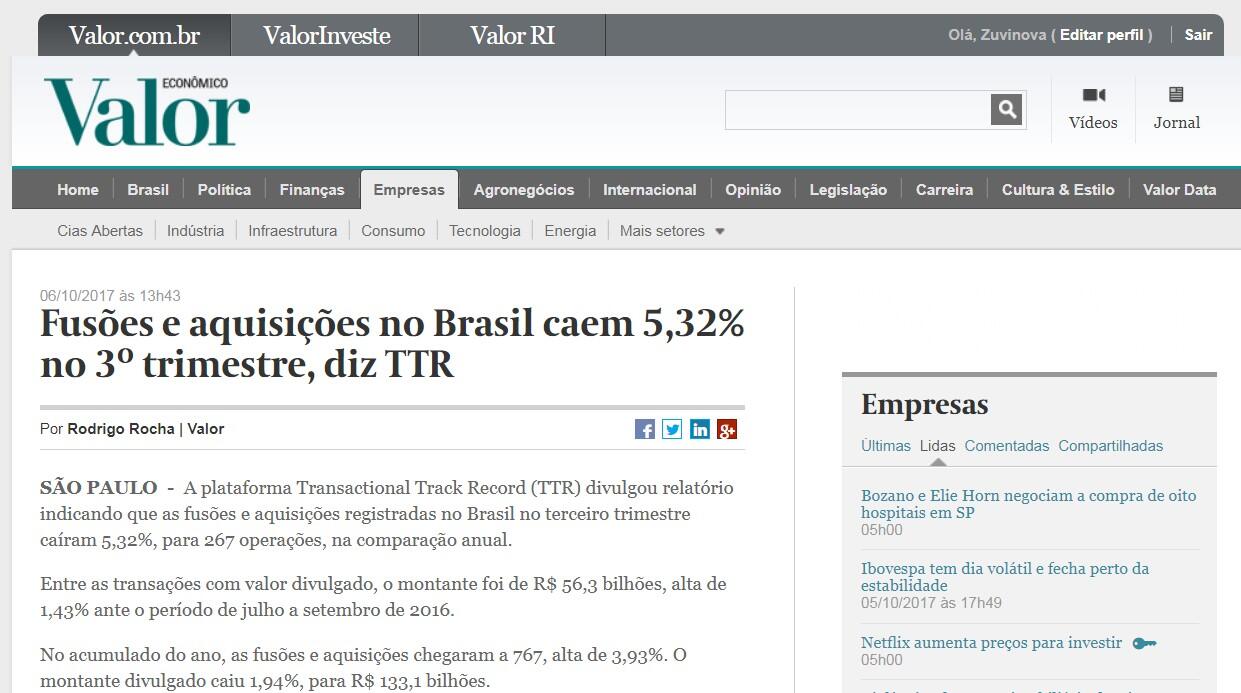 SÃO PAULO - A plataforma Transactional Track Record (TTR) divulgou relatório indicando que as fusões e aquisições registradas no Brasil no terceiro trimestre caíram 5,32%, para 267 operações, na comparação anual.