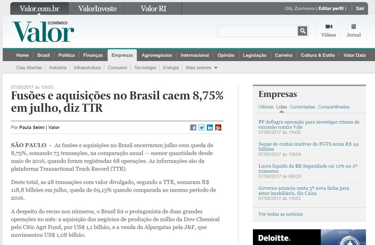 Deste total, as 28 transações com valor divulgado, segundo a TTR, somaram R$ 118,8 bilhões em julho, queda de 69,13% quando comparada ao mesmo período de 2016. A despeito do recuo nos números, o Brasil foi o protagonista de duas grandes operações no mês: a aquisição dos negócios de produção de milho da Dow Chemical pelo Citic Agri Fund, por US$ 1,1 bilhão, e a venda da Alpargatas pela J&F, que movimentou US$ 1,08 bilhão.