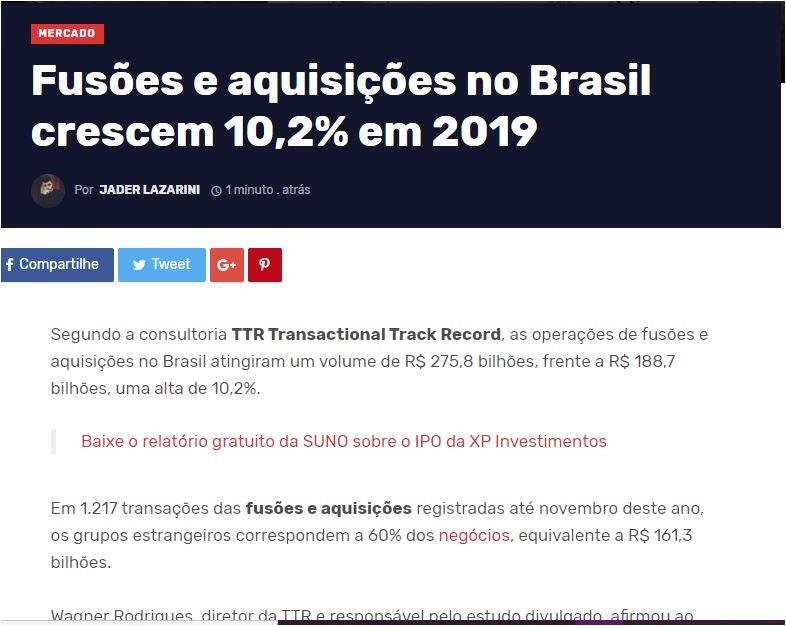 Fusões e aquisições no Brasil crescem 10,2% em 2019
