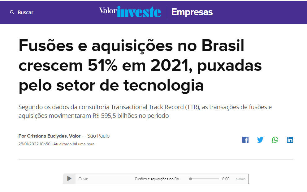 Fusões e aquisições no Brasil crescem 51% em 2021, puxadas pelo setor de tecnologia