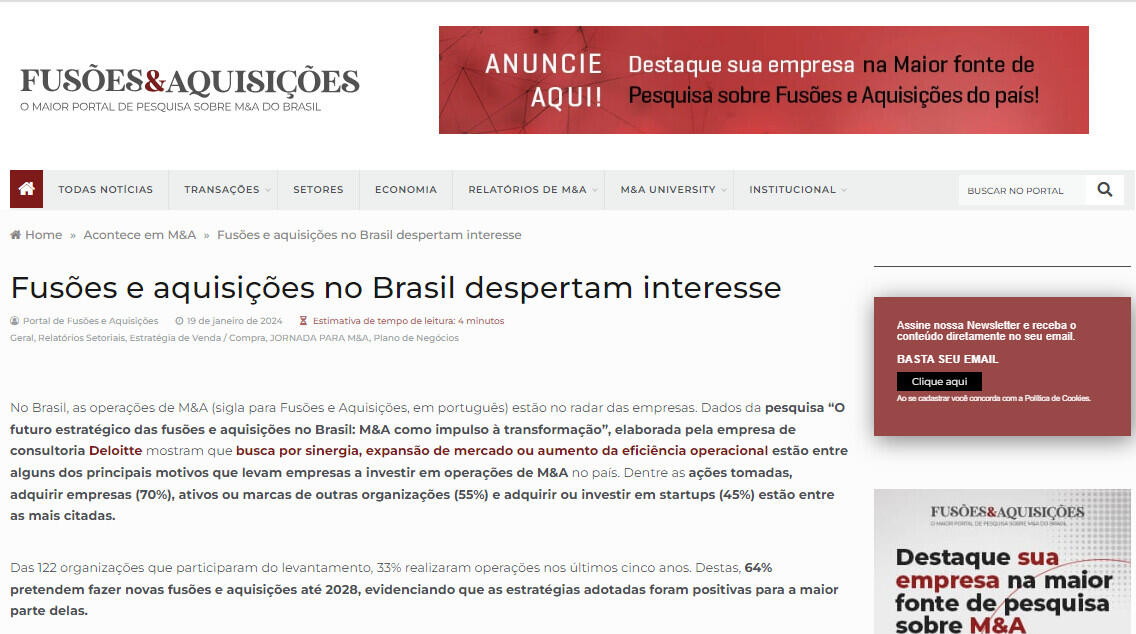 No Brasil, as operações de M&A (sigla para Fusões e Aquisições, em português) estão no radar das empresas. Dados da pesquisa “O futuro estratégico das fusões e aquisições no Brasil: M&A como impulso à transformação”, elaborada pela empresa de consultoria Deloitte mostram que busca por sinergia, expansão de mercado ou aumento da eficiência operacional estão entre alguns dos principais motivos que levam empresas a investir em operações de M&A no país. Dentre as ações tomadas, adquirir empresas (70%), ativos ou marcas de outras organizações (55%) e adquirir ou investir em startups (45%) estão entre as mais citadas.