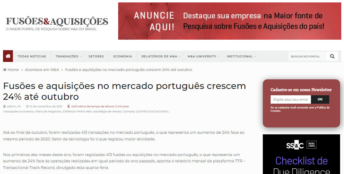 Até ao final de outubro, foram realizadas 413 transações no mercado português, o que representa um aumento de 24% face ao mesmo período de 2020. Setor da tecnologia foi o que registou maior atividade.