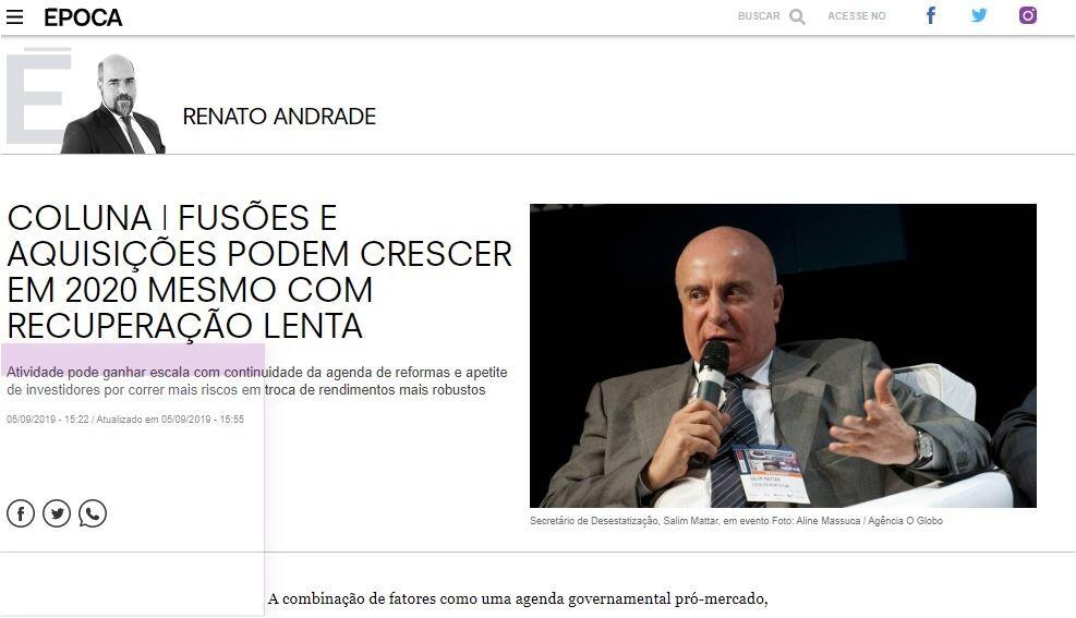 “O volume de negócios pode mudar de patamar porque os fatores nunca foram tão positivos em termos de agenda. Mas não são fatores de curto prazo. Não vamos ter uma explosão de M&A em cinco, seis meses. Vamos ter uma continuidade crescente e podemos mudar de patamar em 2020 porque, olhando o longo prazo, temos estímulo de consumo, perspectivas positivas e excesso de liquidez para capital de risco no Brasil, o que estimula o M&A”, argumenta Pierantoni.