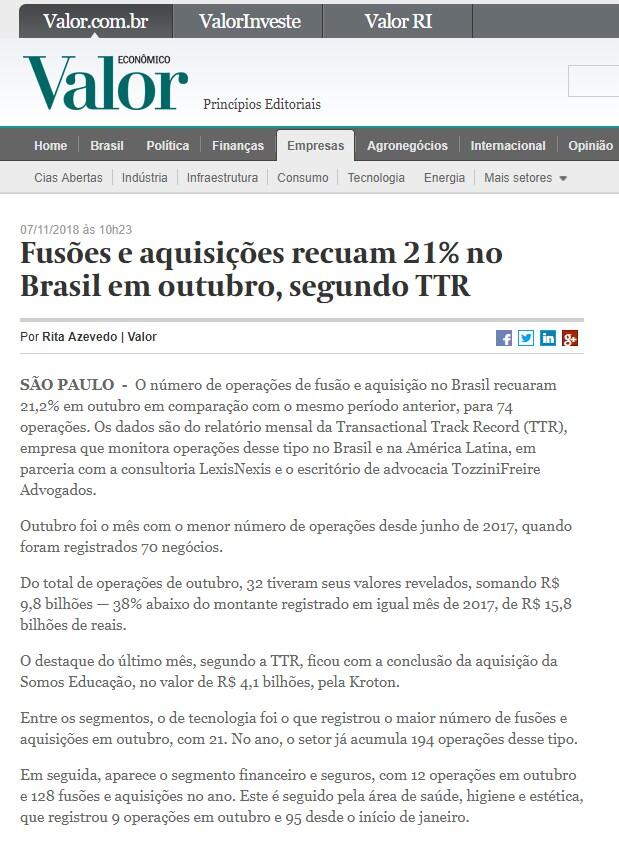 De janeiro a outubro, a TTR registrou 927 anúncios de operações de compra e venda de participação envolvendo empresas brasileiras, 0,7% inferior aos registrados no mesmo intervalo de 2017. Do total, 404 revelaram valores, que somados chegam a R$ 159,9 bilhões — 0,4% maior na comparação anual.