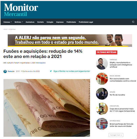 O mercado de fusões e aquisições brasileiro teve um encolhimento de 14% no número de transações em relação ao mesmo período de 2021. Foram 1860 transações e R$ 248,7 bilhões movimentados até outubro, de acordo com o relatório mensal do Transactional Track Record em colaboração com a Intralinks e Tozzini Freire. Desse total, 46% tiveram os valores revelados e 78% das operações já estão concluídas. Em outubro, 97 fusões e aquisições foram registradas, entre anunciadas e concluídas, totalizando R$ 16,2bilhões.