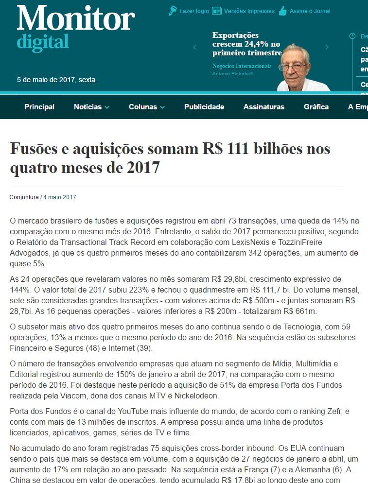 O mercado brasileiro de fusões e aquisições registrou em abril 73 transações, uma queda de 14% na comparação com o mesmo mês de 2016. Entretanto, o saldo de 2017 permaneceu positivo, segundo o Relatório da Transactional Track Record em colaboração com LexisNexis e TozziniFreire Advogados, já que os quatro primeiros meses do ano contabilizaram 342 operações, um aumento de quase 5%.