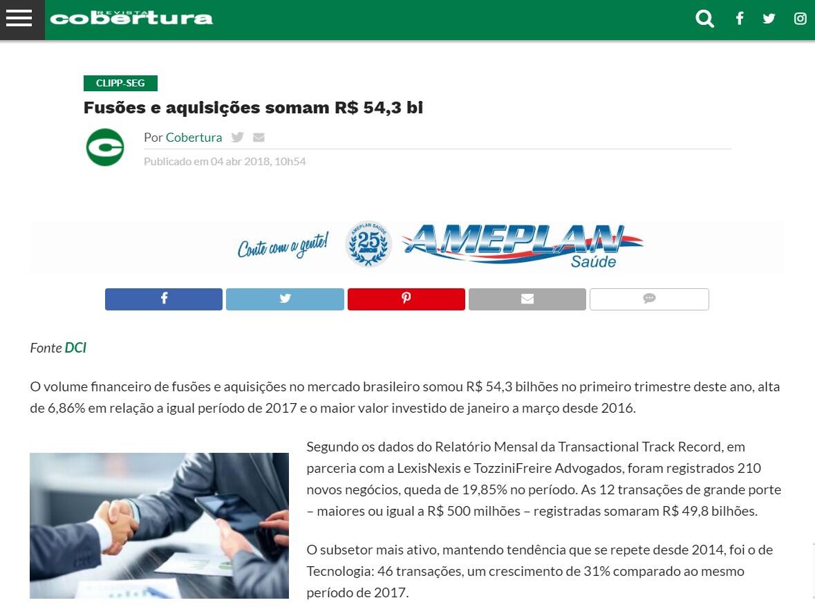 Segundo os dados do Relatório Mensal da Transactional Track Record, em parceria com a LexisNexis e TozziniFreire Advogados, foram registrados 210 novos negócios, queda de 19,85% no período. As 12 transações de grande porte – maiores ou igual a R$ 500 milhões – registradas somaram R$ 49,8 bilhões.
