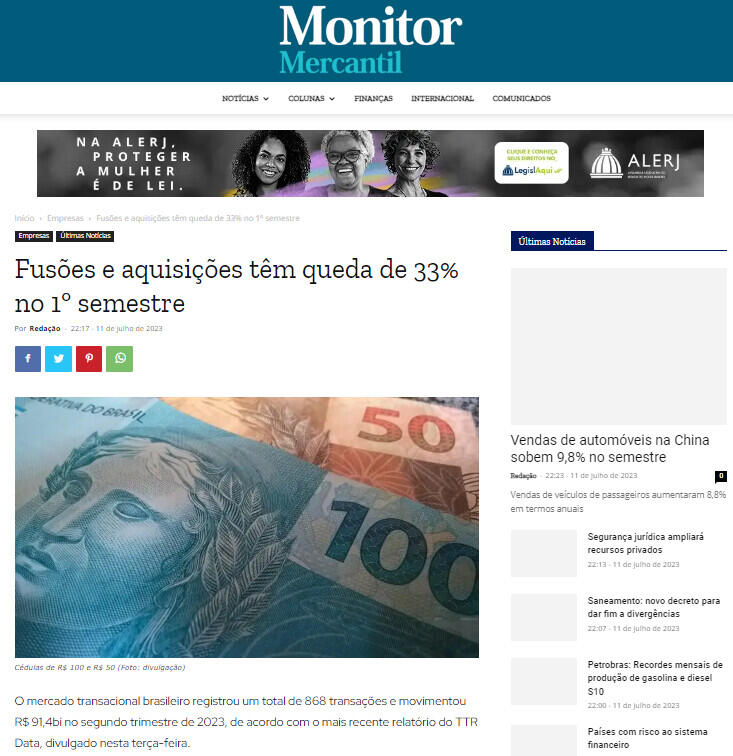 O mercado transacional brasileiro registrou um total de 868 transações e movimentou R$ 91,4bi no segundo trimestre de 2023, de acordo com o mais recente relatório do TTR Data, divulgado nesta terça-feira.