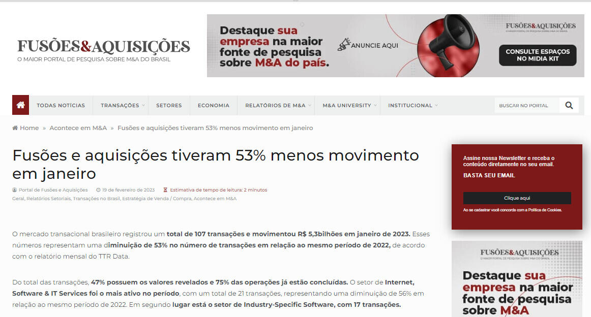 O mercado transacional brasileiro registrou um total de 107 transações e movimentou R$ 5,3bilhões em janeiro de 2023. Esses números representam uma diminuição de 53% no número de transações em relação ao mesmo período de 2022, de acordo com o relatório mensal do TTR Data.