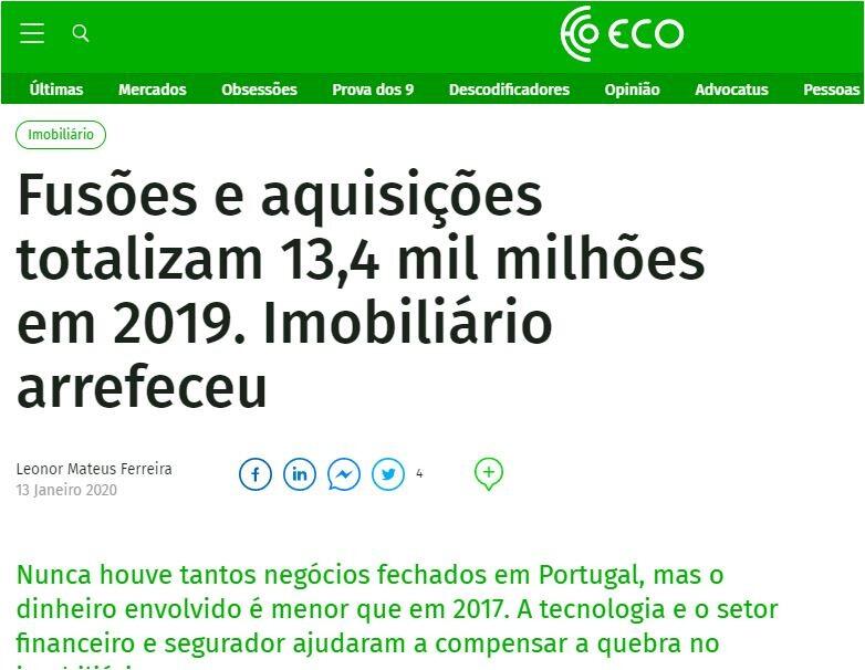 Fusões e aquisições totalizam 13,4 mil milhões em 2019. Imobiliário arrefeceu