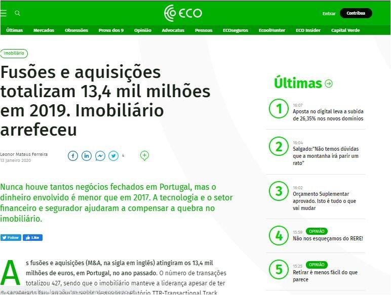 Fusões e aquisições totalizam 13,4 mil milhões em 2019. Imobiliário arrefeceu