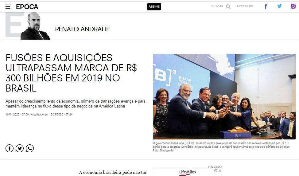 Por causa disso, especialistas já indicavam que o segmento de fusões e aquisições poderia ganhar mais volume em 2020, ano em que muita gente aposta num crescimento mais forte da economia brasileira, que vem amargando expansões tímidas de 1% ao ano desde 2017.
