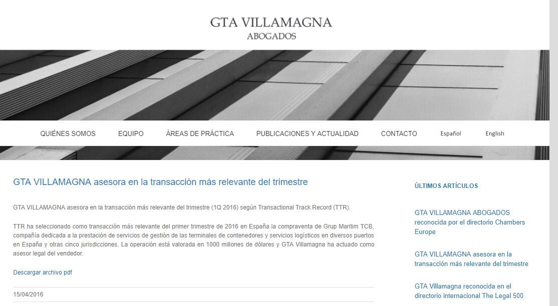 TTR ha seleccionado como transacción más relevante del primer trimestre de 2016 en España la compraventa de Grup Maritim TCB, compañía dedicada a la prestación de servicios de gestión de las terminales de contenedores y servicios logísticos en diversos puertos en España y otras cinco jurisdicciones. La operación está valorada en 1000 millones de dólares y GTA Villamagna ha actuado como asesor legal del vendedor.