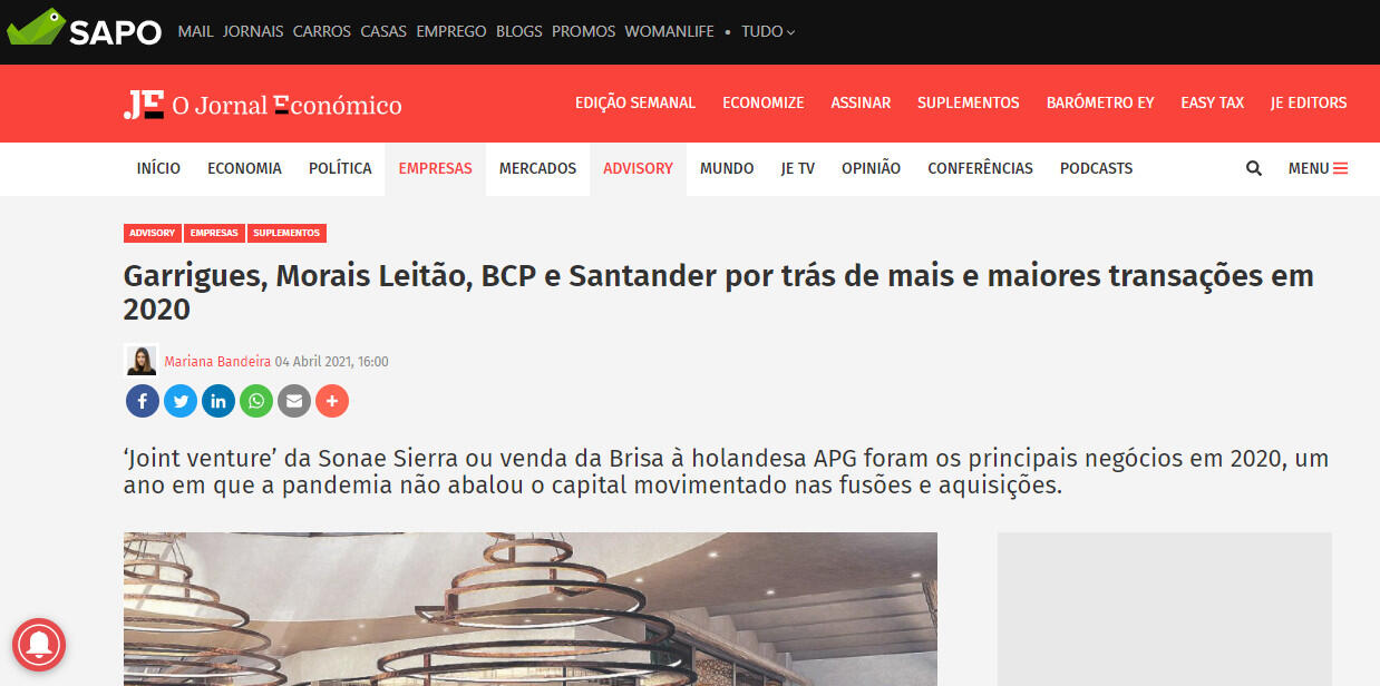 ‘Joint venture’ da Sonae Sierra ou venda da Brisa à holandesa APG foram os principais negócios em 2020, um ano em que a pandemia não abalou o capital movimentado nas fusões e aquisições.