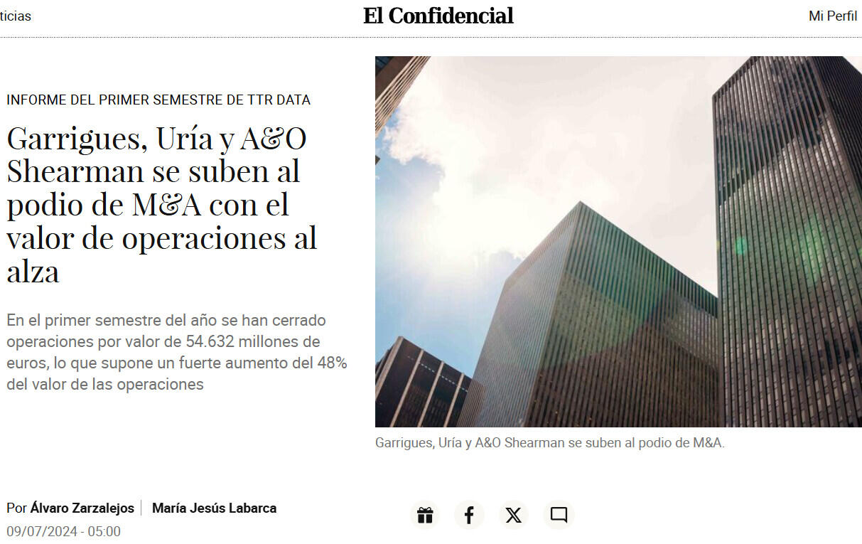 Garrigues, Uría y A&O Shearman se suben al podio de M&A con el valor de operaciones al alza