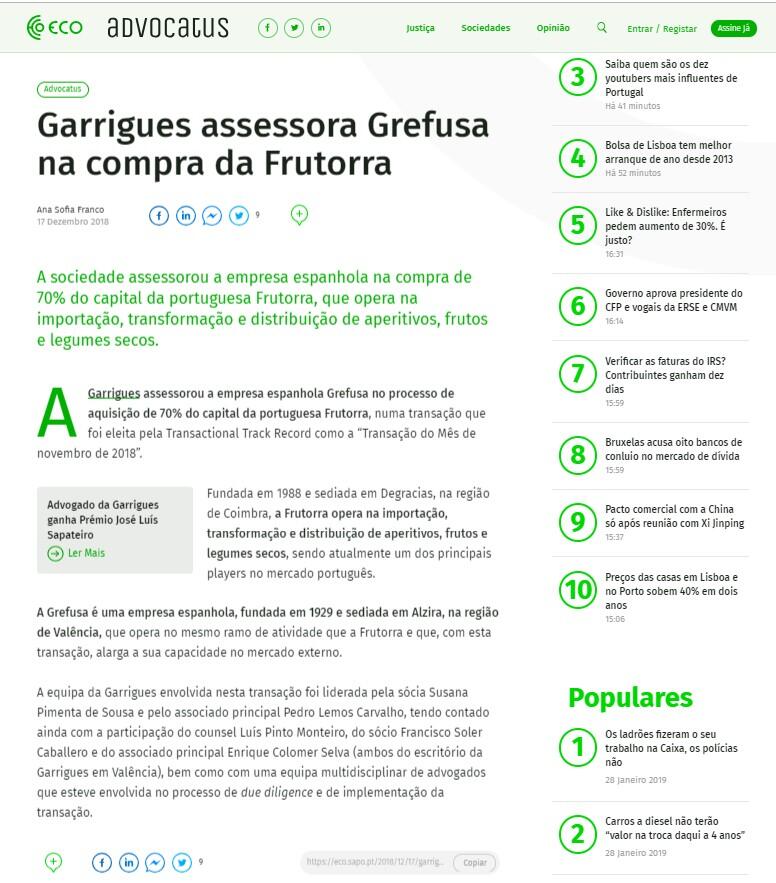 A Garrigues assessorou a empresa espanhola Grefusa no processo de aquisição de 70% do capital da portuguesa Frutorra, numa transação que foi eleita pela Transactional Track Record como a “Transação do Mês de novembro de 2018”.