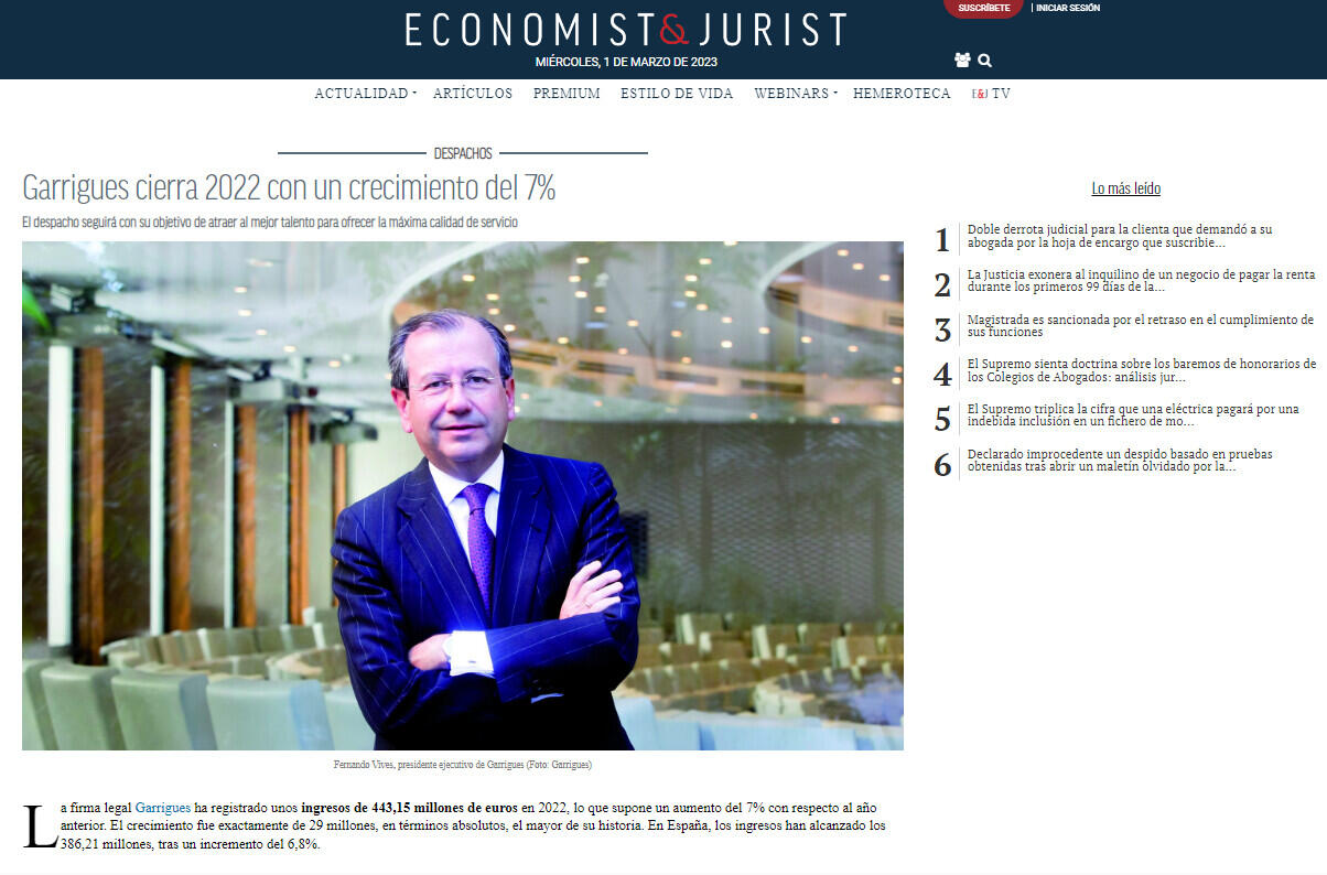 La firma legal Garrigues ha registrado unos ingresos de 443,15 millones de euros en 2022, lo que supone un aumento del 7% con respecto al año anterior. El crecimiento fue exactamente de 29 millones, en términos absolutos, el mayor de su historia. En España, los ingresos han alcanzado los 386,21 millones, tras un incremento del 6,8%.