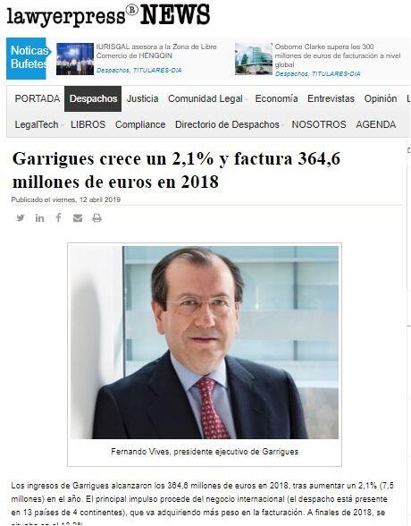 Los ingresos de Garrigues alcanzaron los 364,6 millones de euros en 2018, tras aumentar un 2,1% (7,5 millones) en el año. El principal impulso procede del negocio internacional (el despacho está presente en 13 países de 4 continentes), que va adquiriendo más peso en la facturación. A finales de 2018, se situaba en el 13,2%.
