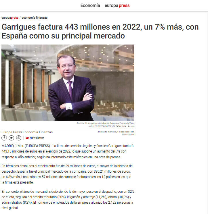 Garrigues factura 443 millones en 2022, un 7% más, con España como su principal mercado