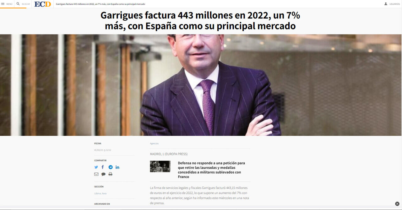 Garrigues factura 443 millones en 2022, un 7% más, con España como su principal mercado