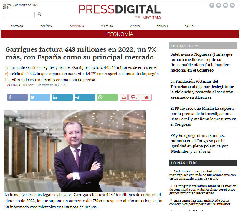 Garrigues factura 443 millones en 2022, un 7% más, con España como su principal mercado