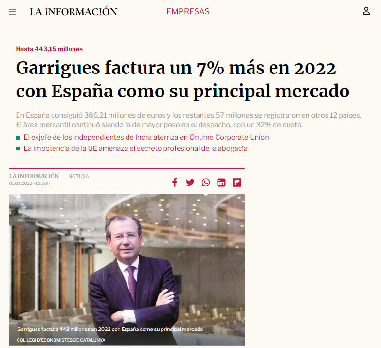 Garrigues factura un 7% más en 2022 con España como su principal mercado