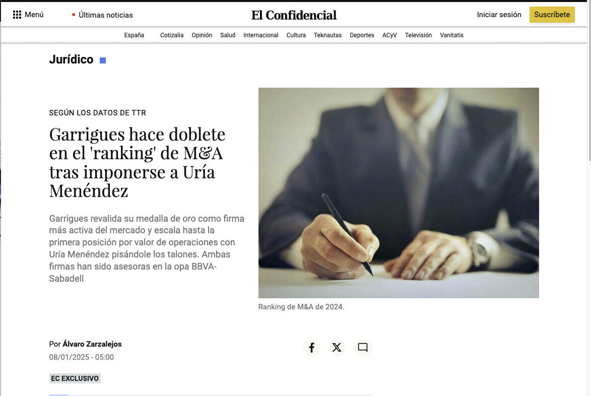 Garrigues hace doblete en el 'ranking' de M&A tras imponerse a Uría Menéndez