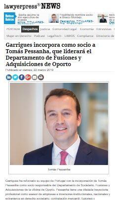 Garrigues incorpora como socio a Tomás Pessanha, que liderará el Departamento de Fusiones y Adquisiciones de Oporto