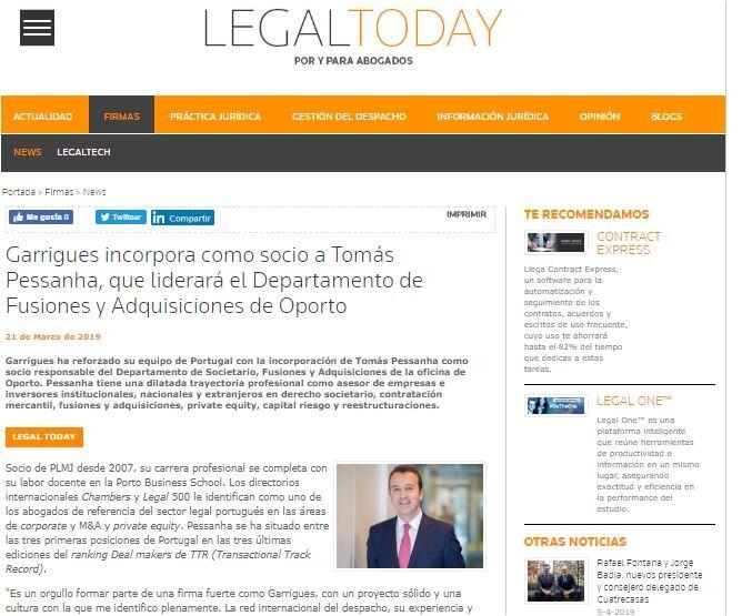 Garrigues incorpora como socio a Tomás Pessanha, que liderará el Departamento de Fusiones y Adquisiciones de Oporto