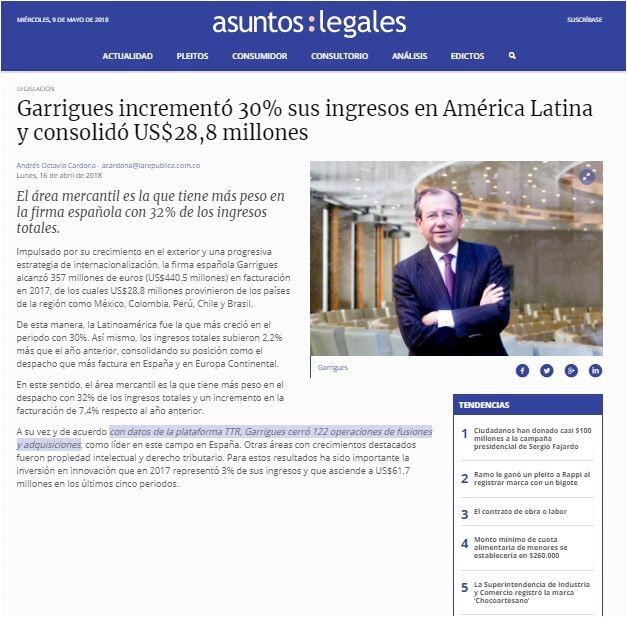 A su vez y de acuerdo con datos de la plataforma TTR, Garrigues cerró 122 operaciones de fusiones y adquisiciones, como líder en este campo en España. Otras áreas con crecimientos destacados fueron propiedad intelectual y derecho tributario. Para estos resultados ha sido importante la inversión en innovación que en 2017 representó 3% de sus ingresos y que asciende a US$61,7 millones en los últimos cinco periodos.