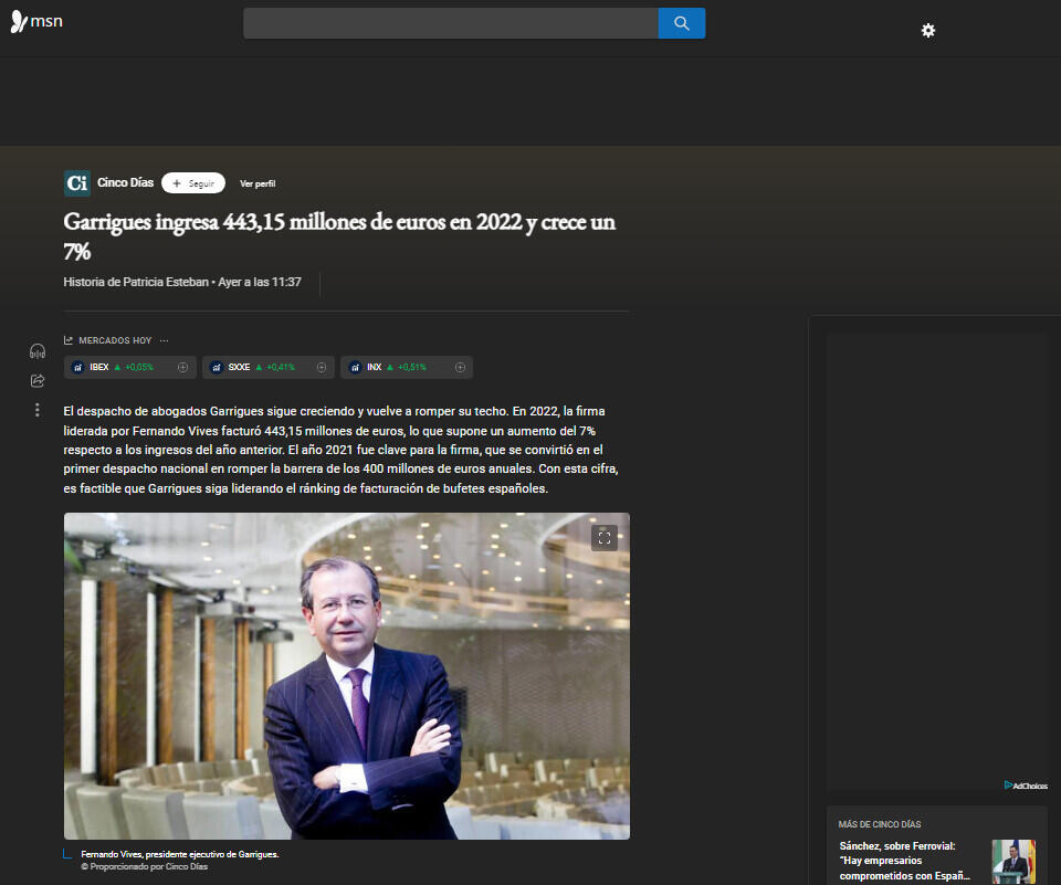 El despacho de abogados Garrigues sigue creciendo y vuelve a romper su techo. En 2022, la firma liderada por Fernando Vives facturó 443,15 millones de euros, lo que supone un aumento del 7% respecto a los ingresos del año anterior. El año 2021 fue clave para la firma, que se convirtió en el primer despacho nacional en romper la barrera de los 400 millones de euros anuales. Con esta cifra, es factible que Garrigues siga liderando el ránking de facturación de bufetes españoles.