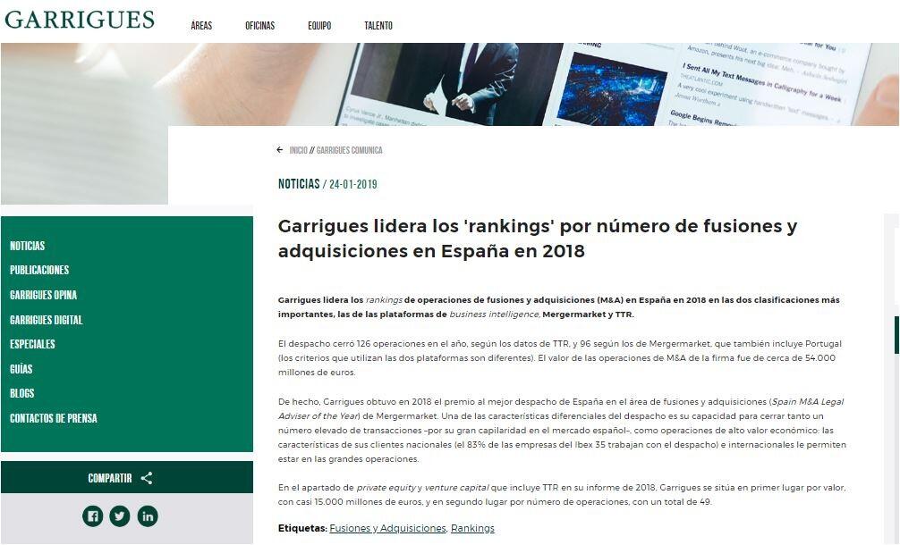 Garrigues lidera los rankings de operaciones de fusiones y adquisiciones (M&A) en España en 2018 en las dos clasificaciones más importantes, las de las plataformas de business intelligence, Mergermarket y TTR.