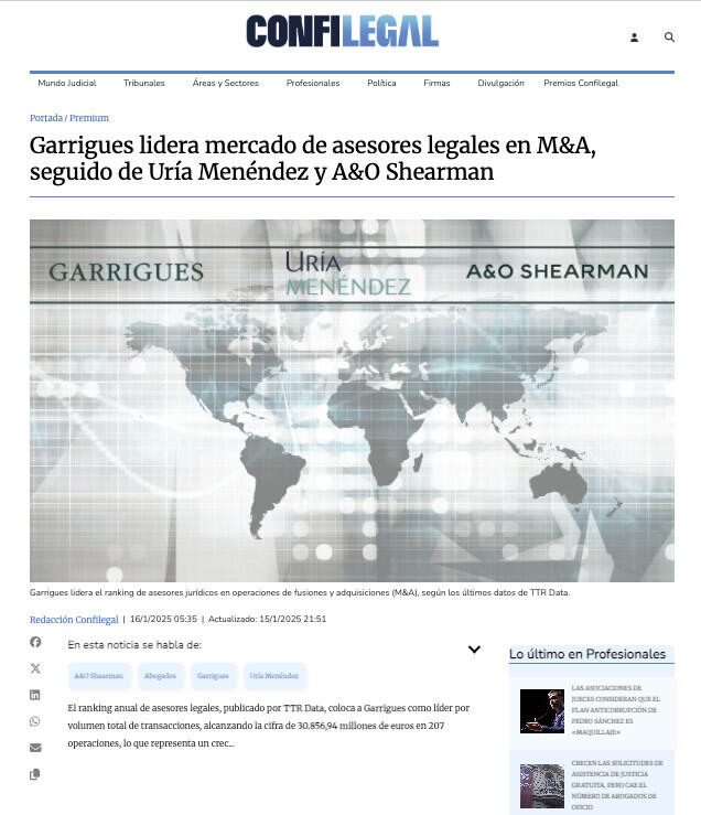 El ranking anual de asesores legales, publicado por TTR Data, coloca a Garrigues como líder por volumen total de transacciones, alcanzando la cifra de 30.856,94 millones de euros en 207 operaciones, lo que representa un crec...