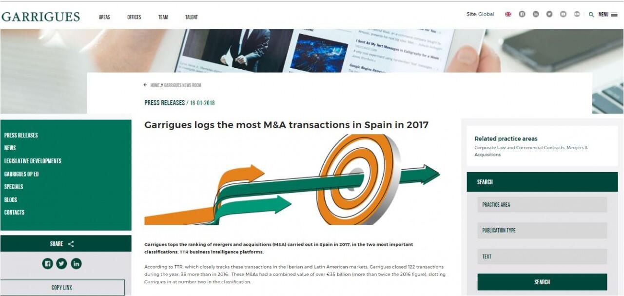 Garrigues tops the ranking of mergers and acquisitions (M&A) carried out in Spain in 2017, in the two most important classifications: TTR business intelligence platforms.