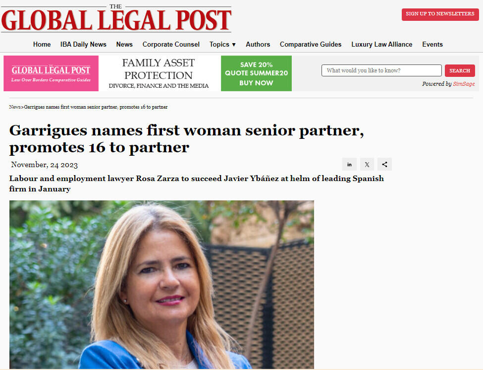 Top Spanish firm Garrigues has announced that labour and employment lawyer Rosa Zarza will be its next senior partner, becoming the first women to hold the position at the firm.